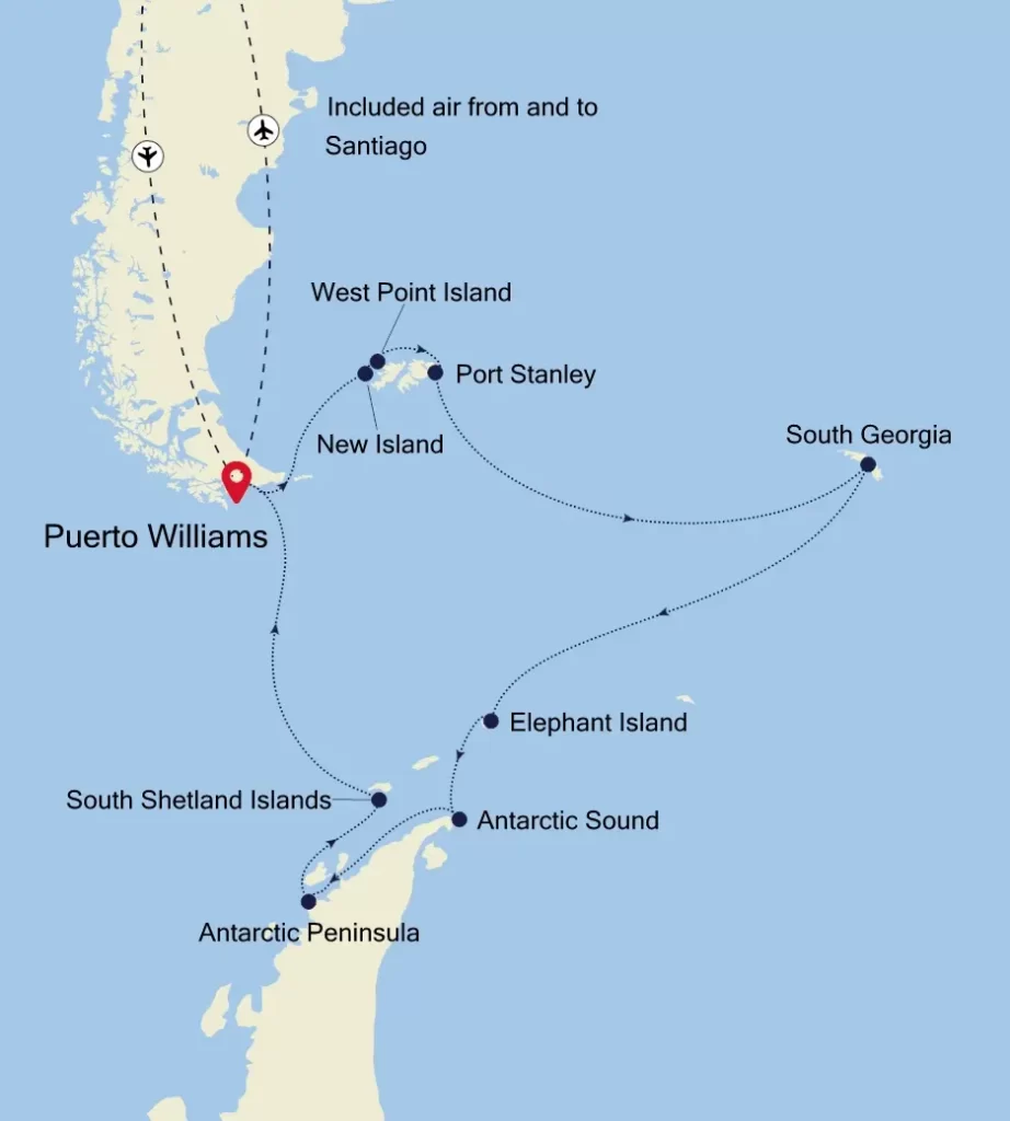 - Roundtrip charter flights between Santiago & Puerto Williams on Day 1 & Day 19